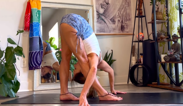 Then she pressed back into downward dog, her heels reaching toward the floor, her hips lifting high. Her body formed a gentle inverted V, lengthening and strengthening at the same time.