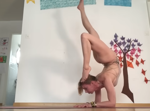 She guided them through a flowing sequence that blended yoga poses with dynamic movements. From downward dog to handstand attempts, from lunges into controlled kicks, and finally into split variations that tested both flexibility and endurance.