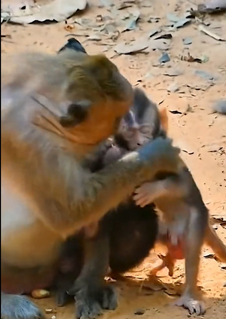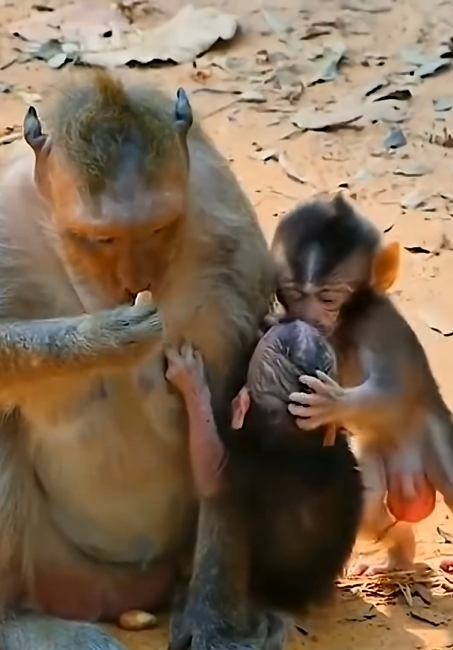 That morning, the baby monkey noticed another baby monkey resting quietly in its mother’s arms. The second baby was nursing, calm and focused on its mother’s warmth and care. It held tightly, completely absorbed in the comfort it was receiving.