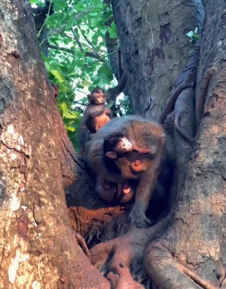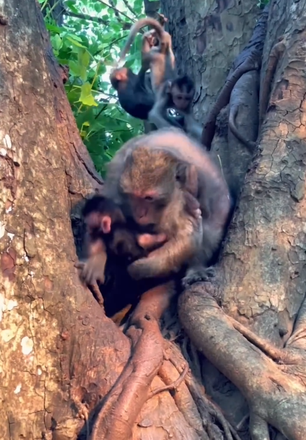 That morning began like many others. The sunlight slipped through the leaves, painting soft golden shapes on the ground. Birds called from above, and the air was fresh and full of energy. Daisy had already decided it would be a climbing day. Her target, as always, was Mom.