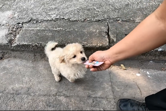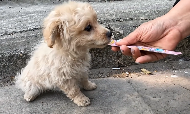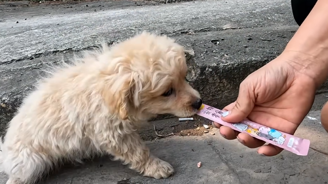 Near the side of the road, tucked close to a wall as if trying to stay invisible, was a tiny puppy.