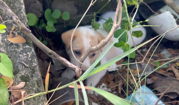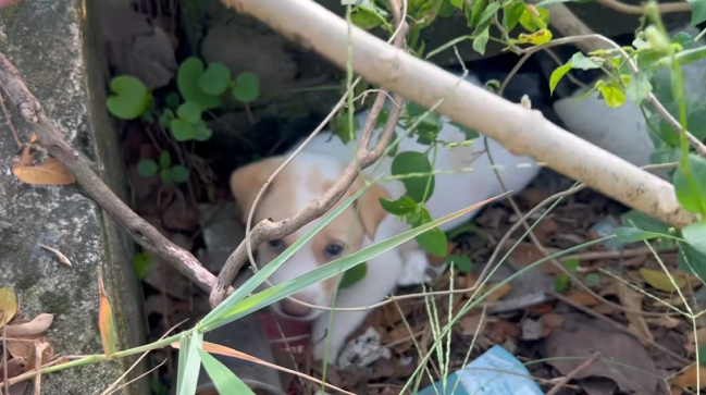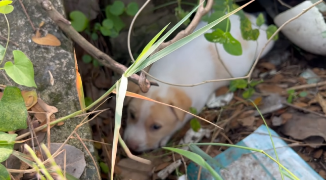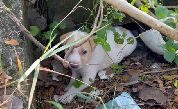 At first, I thought it was a small animal caught in the brush. But as I approached the sound, my eyes caught movement—a tiny puppy, curled up near a cluster of bushes. He looked scared, tired, and confused. His fur was matted and dirty, his little body trembling as he tried to stay hidden.