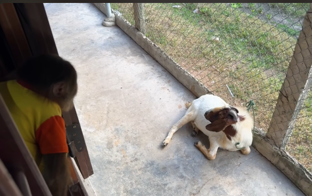 The baby, now calm and fascinated by the goat’s enthusiastic munching, reached out gently to touch the goat through the fence. CUTIS allowed this interaction, keeping a protective stance, ready to intervene if necessary. The scene was heartwarming: a dog managing both the care of a human baby and the feeding of a hungry goat with unwavering patience.