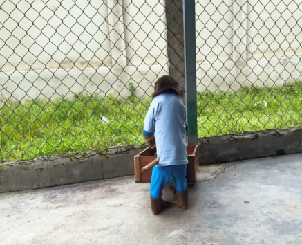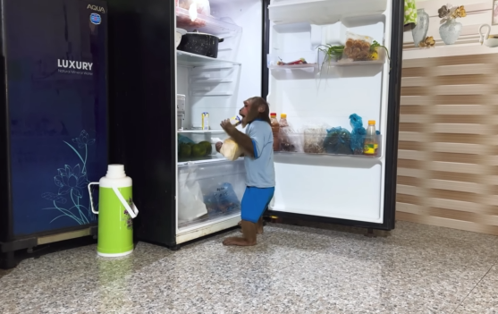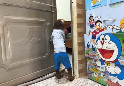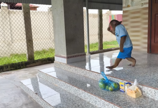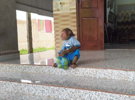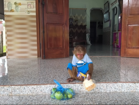 Inside the house, CUTIS was already up, full of energy, pacing back and forth with excitement. Nearby, the baby monkey was bouncing around, curious as always, peeking into corners, grabbing small objects, and making soft chattering sounds.