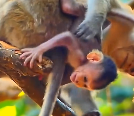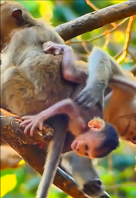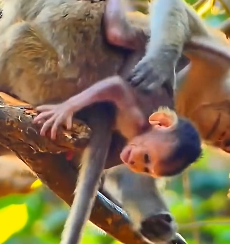 The sun rose over the forest canopy, filtering through leaves in dappled patterns. The troop was active early, as usual, climbing, jumping, and grooming one another. The little monkey in question, barely weeks old, was full of energy and curiosity. Its tiny legs carried it quickly from branch to branch, squeaking happily, exploring the world with innocent enthusiasm.