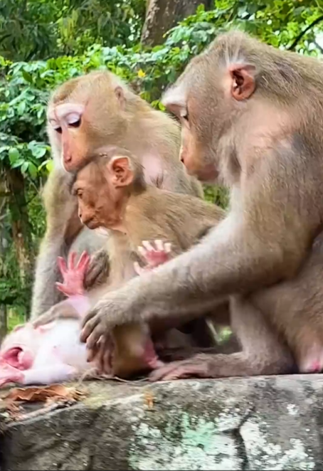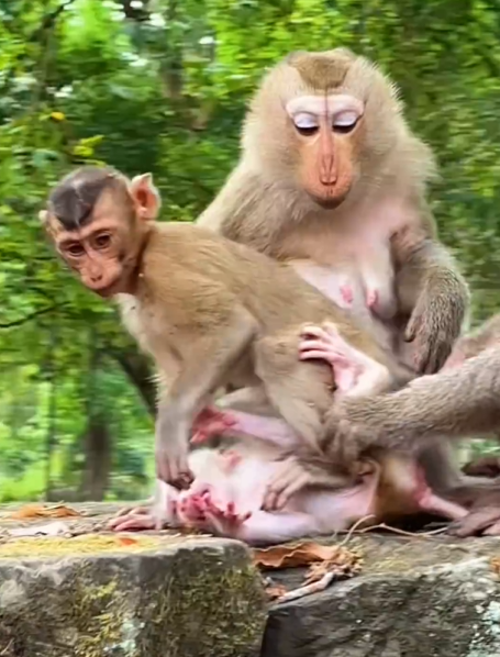 Without waiting for a response, they moved closer to the monkey, lowering themselves slowly to avoid causing more panic. The baby flinched at first, its body tensing as if expecting more harm.