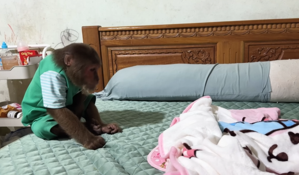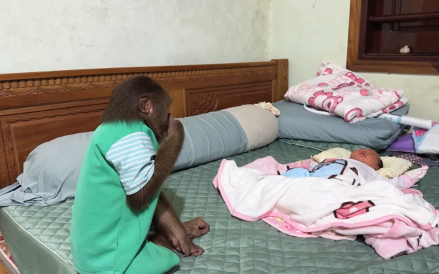 CUTIS tilted her head, observing the tiny human. The baby monkey reached out a small hand, almost touching the blanket, but froze when the baby yawned. CUTIS couldn’t hold back a chuckle—a soft, almost human-like laugh that made the baby monkey pause. The tiny one’s eyes sparkled with both awe and amusement. They were witnessing something magical, something utterly strange, and completely hilarious.