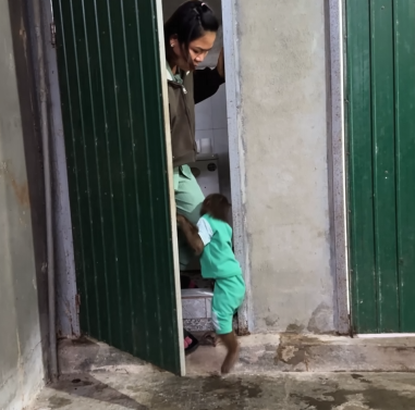 The caretakers noticed the commotion and peeked in to see the scene. There was CUTIS, laughing uncontrollably, and the baby monkey bouncing in place, both completely fixated on the newborn. They couldn’t stop giggling at the reactions of the monkeys, who seemed to have discovered the “big secret” of the newborn baby: that even the tiniest humans could produce enormous entertainment without doing anything intentional.