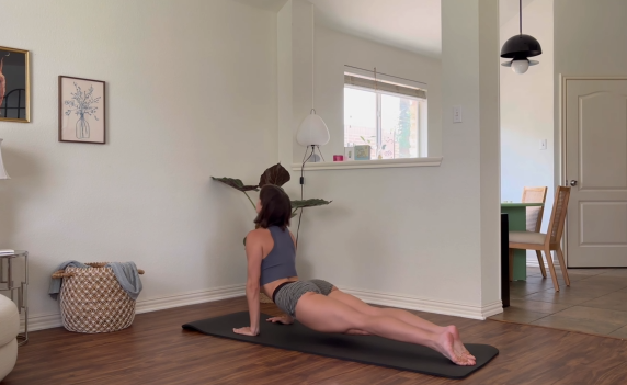 Then gently lower your knees, chest, and chin to the mat—or move directly into a low push-up if you prefer. From there, slide forward into a gentle cobra pose, lifting your chest while keeping your elbows slightly bent.