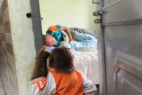 Throughout the day, CUTIS and baby monkey continued to check on their dad, bringing him water, offering small snacks, and keeping him company. They even fetched blankets and adjusted pillows to make him more comfortable, showing an understanding of care that was truly remarkable. Their dedication never wavered, even when their dad’s condition seemed slow to improve.