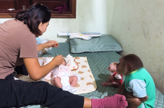 The baby monkey, now sitting nearby, looked between Mom and CUTIS, as if trying to understand the moment it had helped create.