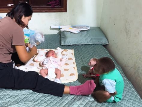Mom reached out, gently touching the baby monkey’s head, then looking at CUTIS.