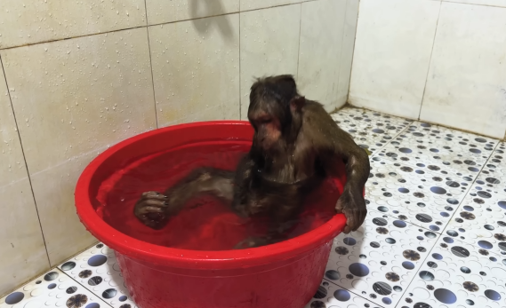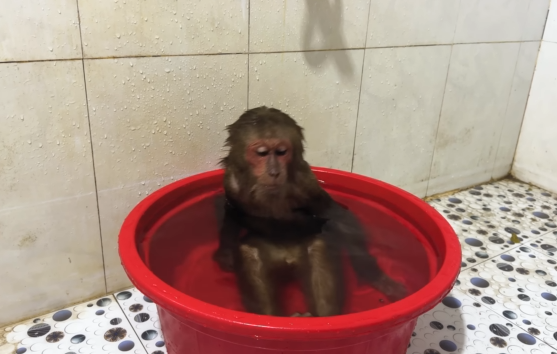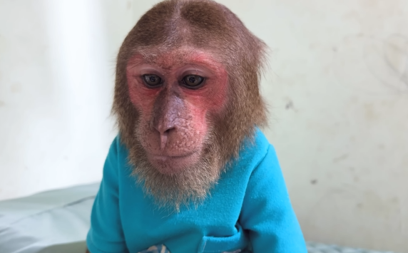 The baby monkey sat there, frozen in confusion.