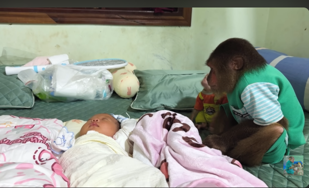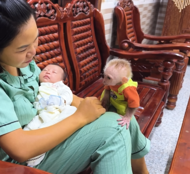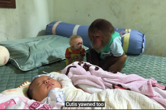 The baby monkey slowly climbed closer, trying to understand what was happening. It reached out a small hand toward the newborn, then looked back at CUTIS for approval.