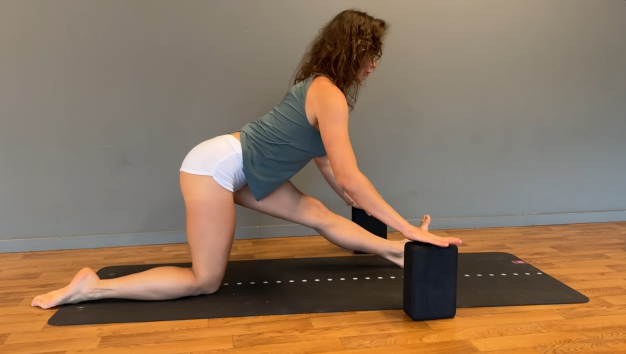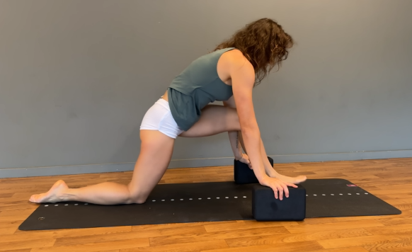From there, she transitioned into a low lunge, stepping one foot forward between her hands. Her hips sank gently, stretching the front of her back leg.
