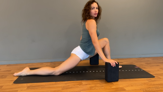 She placed her hands on her front knee and lifted her chest, opening her heart.