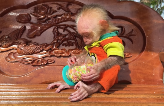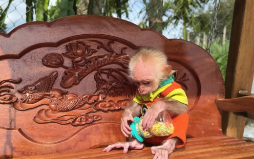 As the experience continues, the baby monkey becomes more comfortable and confident. It explores more freely, trying different items and interacting with its surroundings. The initial hesitation fades, replaced by curiosity and enjoyment.