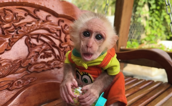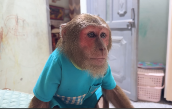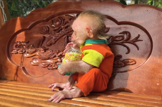 The “restaurant” setting also adds a layer of excitement. While the baby monkey may not fully understand the concept of dining, it can still sense that this moment is different from its usual routine. The environment feels special, and that sense of occasion adds to the overall experience.