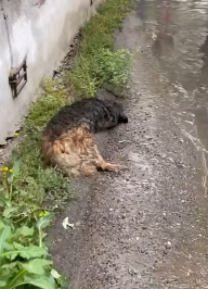 He lay near the edge of the road, half-hidden beside a broken curb, his body curled in a way that didn’t look natural. Rain soaked through his thin fur, pressing it flat against his skin. His breathing was uneven, shallow, barely visible under the constant downpour.